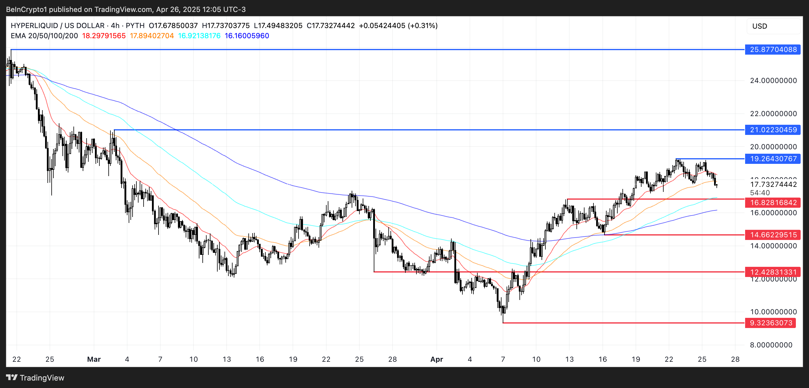 Ett tydligt genombrott över den nivån kan öppna vägen mot 21 USD, och om momentumet förblir starkt kan HYPE stiga till 25,87 USD.
