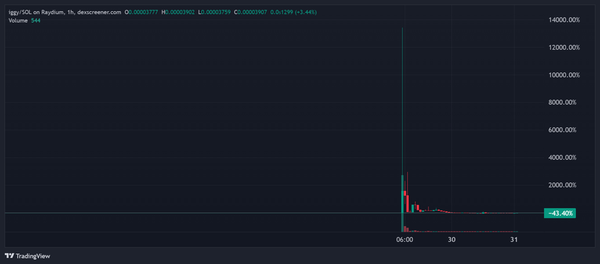 Under sin debut visade IGGY en stark prestanda. Enligt data från DEX Screener nådde det snabbt ett börsvärde på cirka 3 miljoner dollar. Ändå, i skrivande stund, handlas IGGY nu till $0,00003907, med marknadsvärdet sjunkit till $39 000.