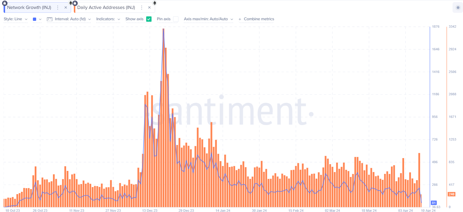 INJ har sett en stadig fas av konsolidering med sina dagliga aktiva adresser. den 9 april överträffade dagliga aktiva adresser 1,000 för första gången sedan den 12 januari. Dessutom ligger nätverkstillväxten, som visar antalet nya adresser som skapas dagligen, på 234 från och med den 9 april. En ökning från den lägsta nivån 2024 på 130 som noterades den 4 april.