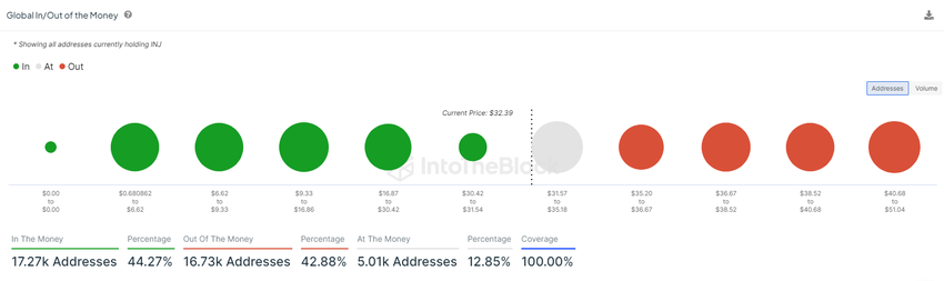 Dessutom är 44.27% av INJ-innehavarna i detta intervall i grönt. Medan för närvarande är 42.88% kvar i rött. 12.85% förblir break-even. Det aktuella priset är fortfarande en central punkt för innehavare eftersom varje uppåtgående rörelse kan driva fler “Out of the Money” -innehavare till vinst.
