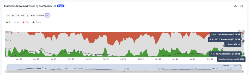 Prisdynamiken för Injective (INJ) avslöjar att 83% av de aktiva innehavarna ligger på break-even, vilket antyder att de väntar på en prisuppgång. Samtidigt har INJ: s aktiva adresser nyligen ökat efter ett dopp i slutet av mars.