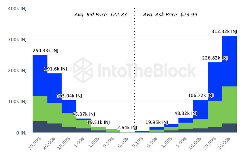 Om detta händer kan INJ:s pris uppleva ytterligare en omgång av nedåtgående tryck. Dessutom återspeglar Exchange On-Chain Market Depth ytterligare ett bevis på detta. Detta mått ger insikter om vad som händer i orderböckerna för de 20 börserna.