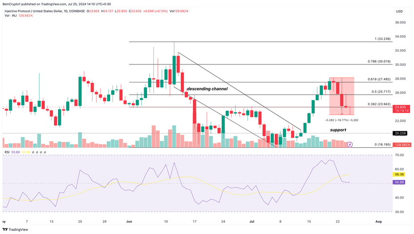 Om RSI-avläsningen fortsätter att sjunka, kommer INJ:s pris också att sjunka. Om så är fallet kan kryptovalutans värde sjunka till $20,22, vilket en gång var ett solidt stöd.