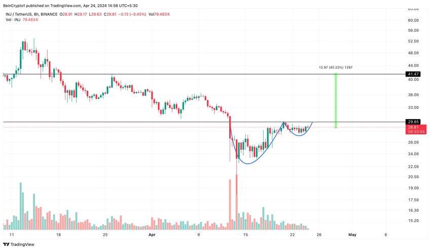 På handelsfronten sjönk INJ över 50% från sin högsta nivå inom en månad. Dess nuvarande marknadsbeteende indikerar dock en hausseartad vändning. Teknisk analys visar att INJ har bildat ett kopp- och handtagsmönster, vilket är en stark hausseartad signal.