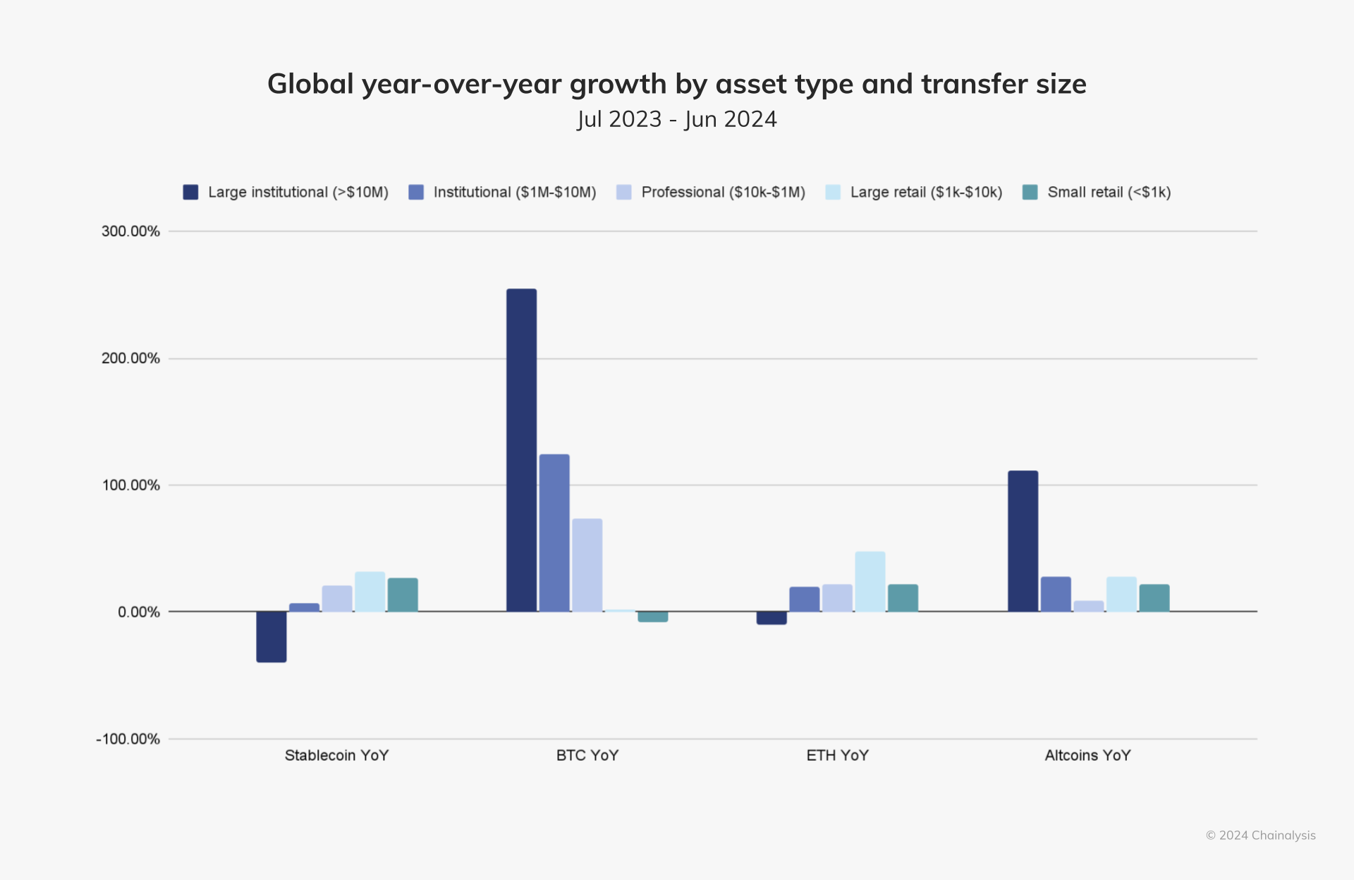Global år-för-år tillväxt efter tillgångstyp och överföringsstorlek. Källa: Chainalysis.