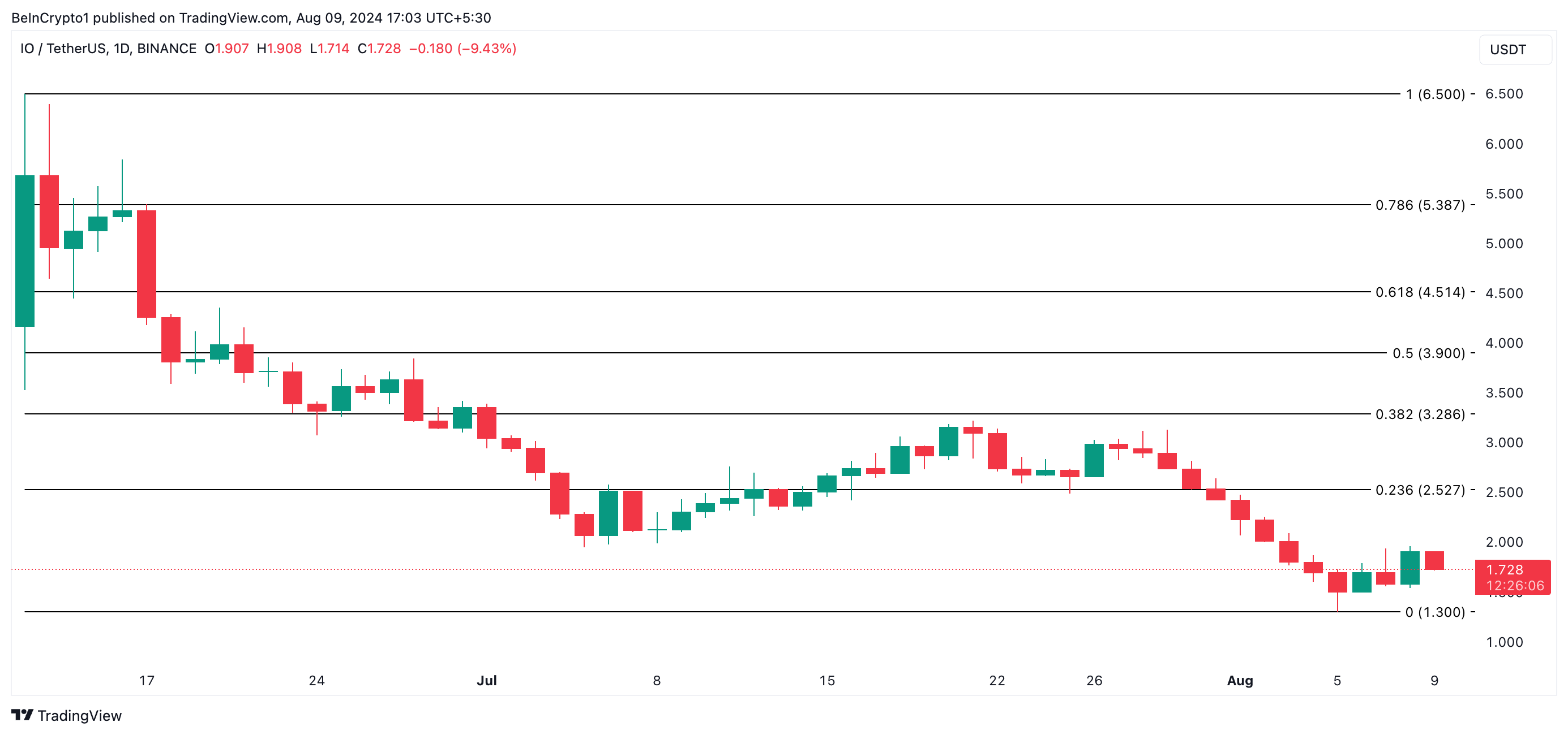 Priset på IO, den inhemska tokenen för den ledande leverantören av DePIN-lösningar io.net, har stigit med 32% från måndagens lägsta nivå på $1,50. Altcoin hade sjunkit till denna låga nivå efter en allmän marknadsnedgång som ledde till över 1 miljard dollar i likvidationer.