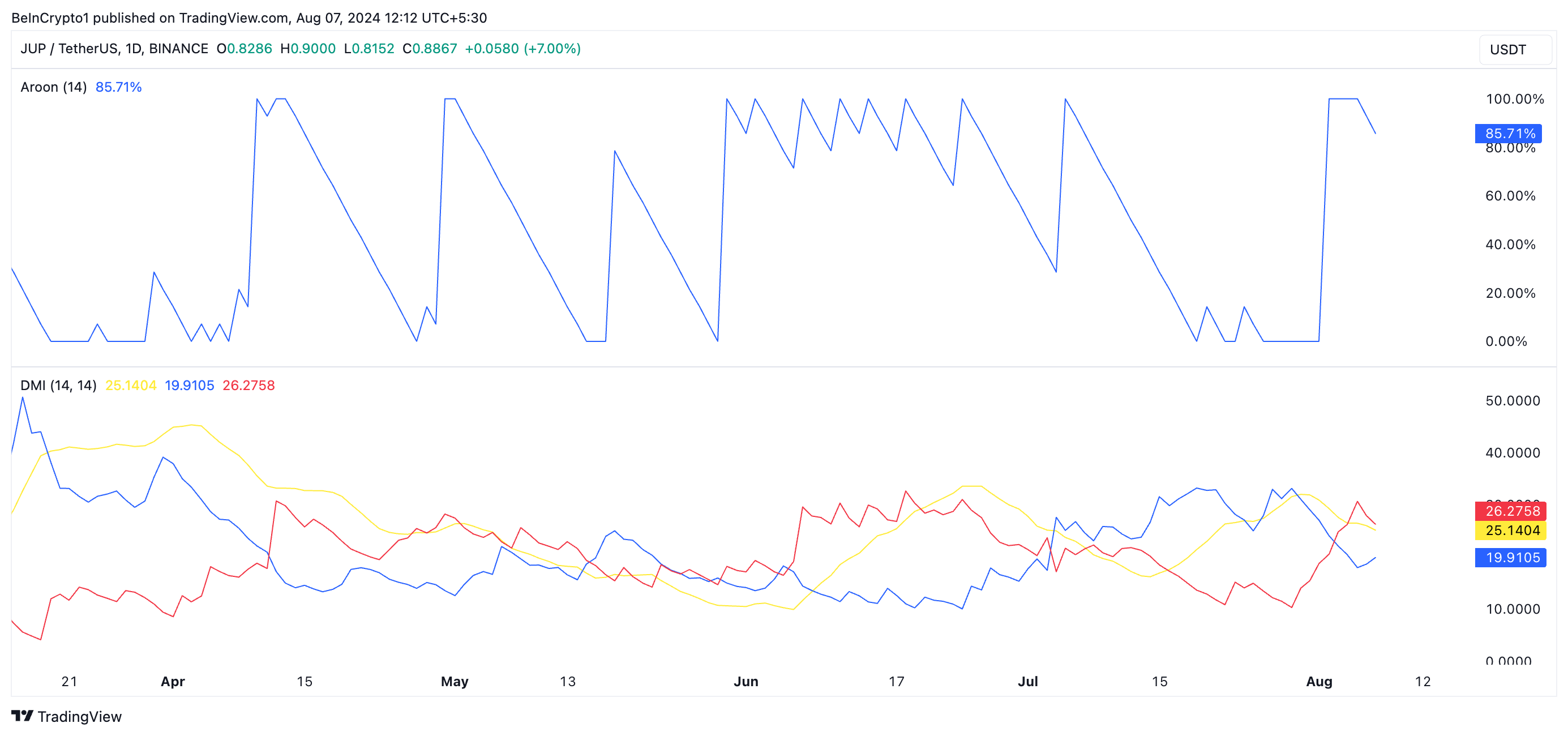 Dessutom bekräftar viktiga momentumindikatorer som observerats på ett dagligt diagram att JUP:s nedåtgående trend är stark. Till exempel är dess Aroon Down Line 85,71 % när detta skrivs. En tillgångs Aroon-indikator mäter dess trendstyrka och identifierar potentiella prisvändningspunkter.