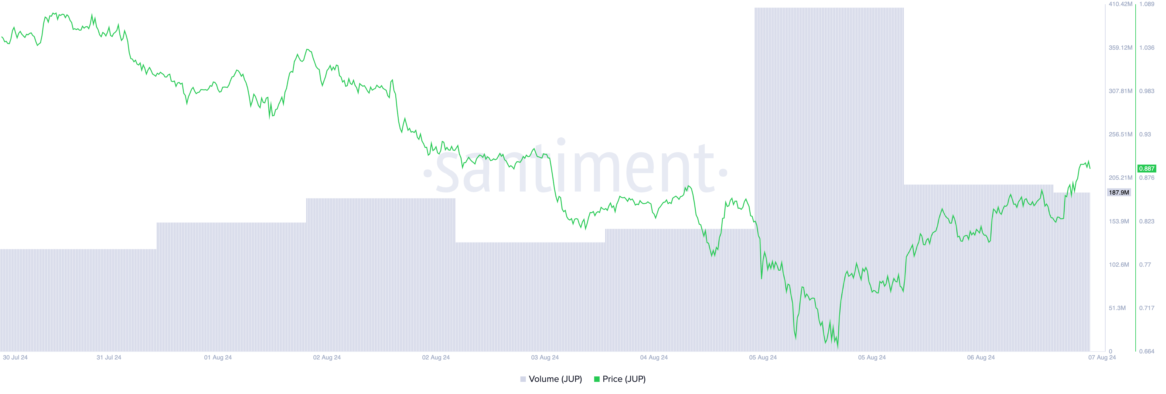 JUP, den inhemska tokenen för den Solana-baserade decentraliserade börsen Jupiter, har upprätthållit en nedåtgående trend sedan den 29 juli.