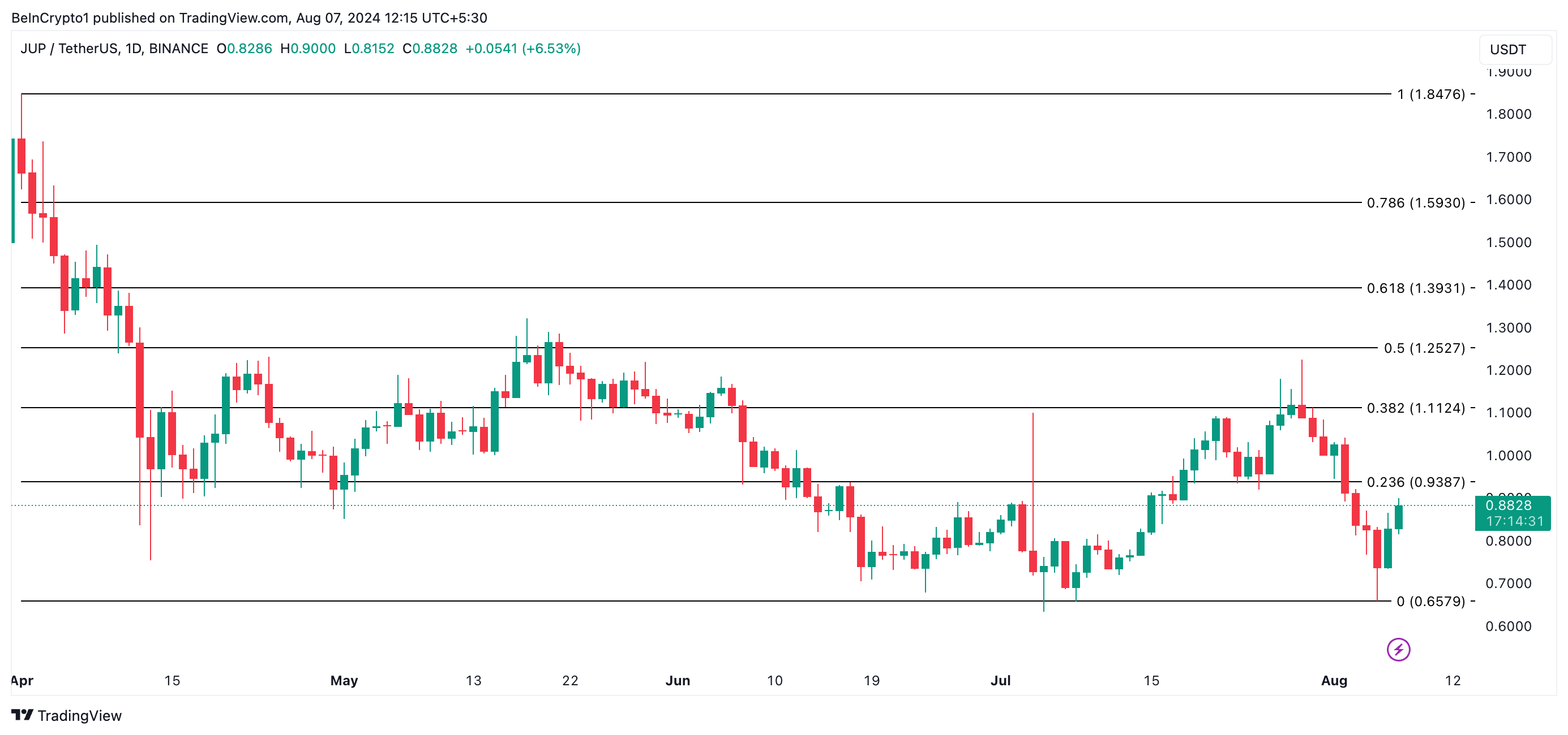 Om JUP behåller sin nedåtgående trend är nästa prismål 0,65 dollar, ett fall med 26% från dess nuvarande värde.