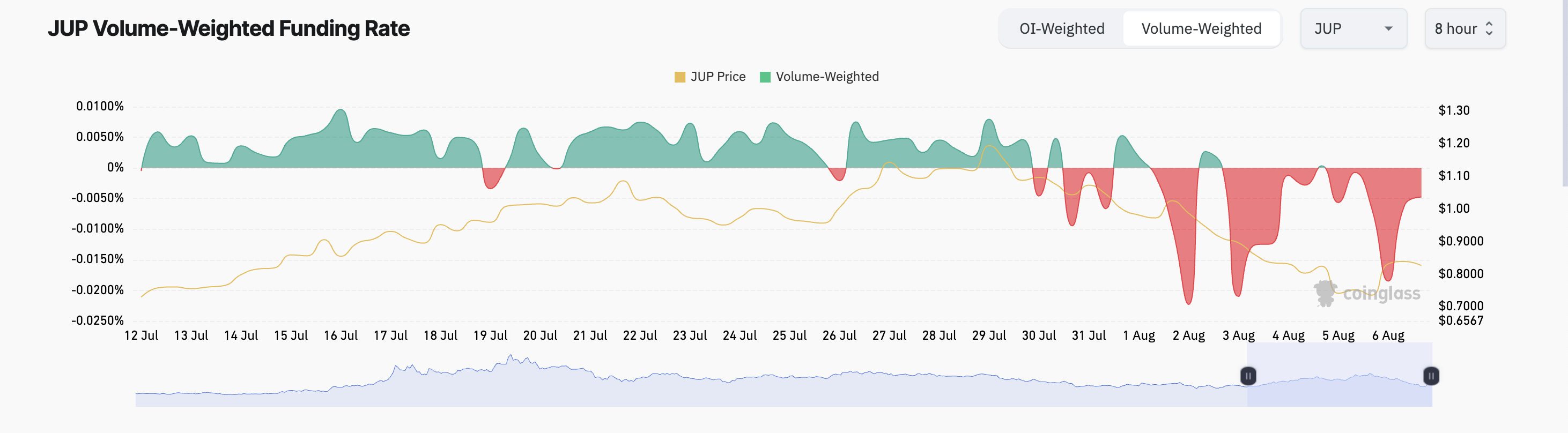 På sin terminsmarknad har JUP-handlare främst krävt korta positioner sedan början av augusti, vilket framgår av dess negativa finansieringsräntor. Vid presstillfället är tokens finansieringsränta -0,0048%.
