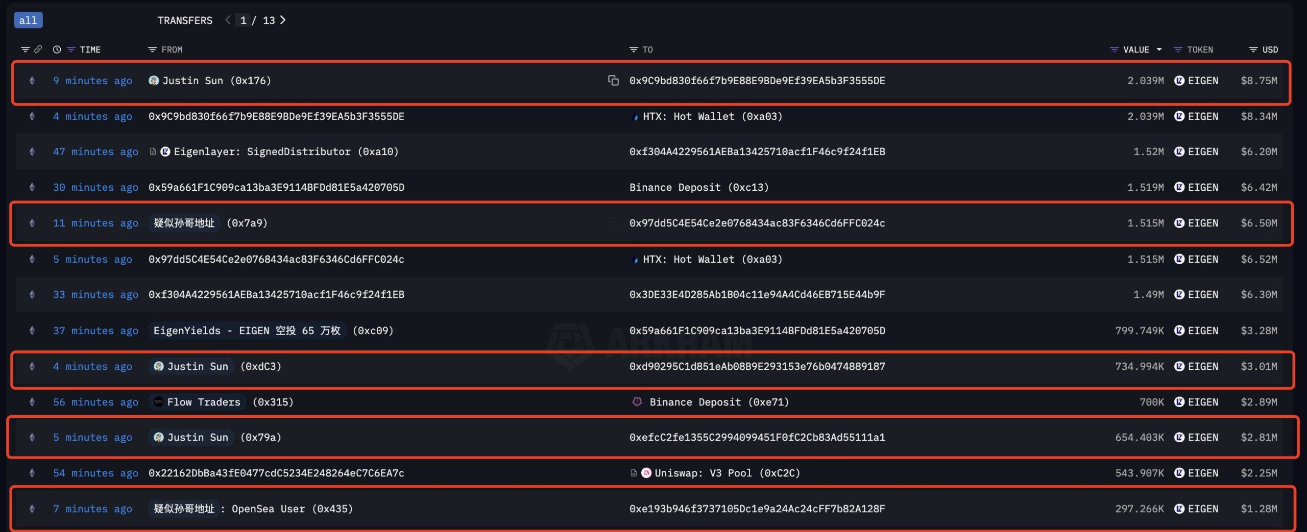 “Justins Suns team har överfört 5,37 miljoner EIGEN till Huobi HTX genom fem adresser, värda ungefär 21,8 miljoner USD. Baserat på det nuvarande priset på 4,06 USDT är EIGEN:s FDV ungefär 6,8 miljarder USD,” rapporterade WuBlockchain här.