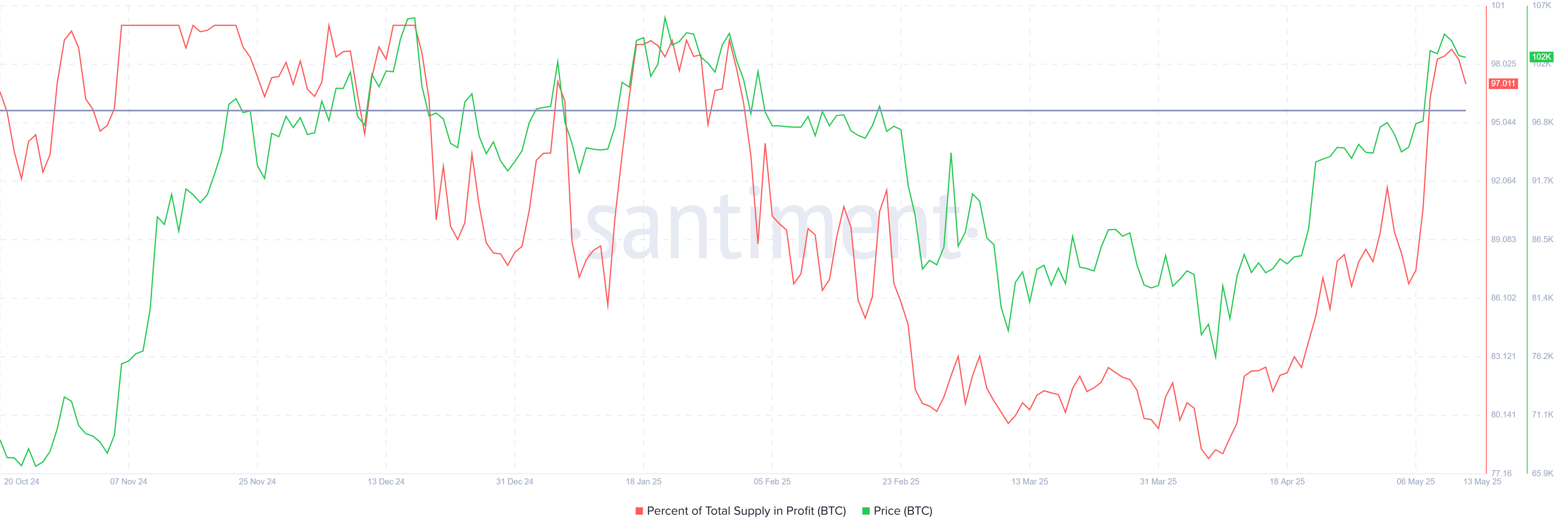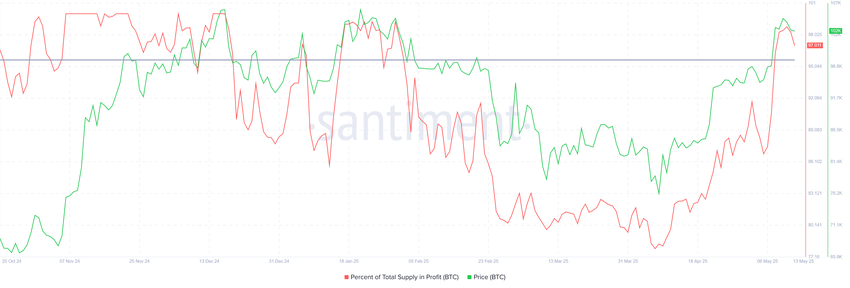 Bitcoin visar tecken på att uppfylla villkoren för att bilda en marknadstopp. För närvarande är över 98 % av den totala Bitcoin-tillgången i vinst, vilket överstiger 95 %-gränsen som vanligtvis är kopplad till marknadstoppar. Historiskt sett har Bitcoin sett prisvändningar och nedgångar efter sådana förhållanden, men situationen kan vara annorlunda denna gång.