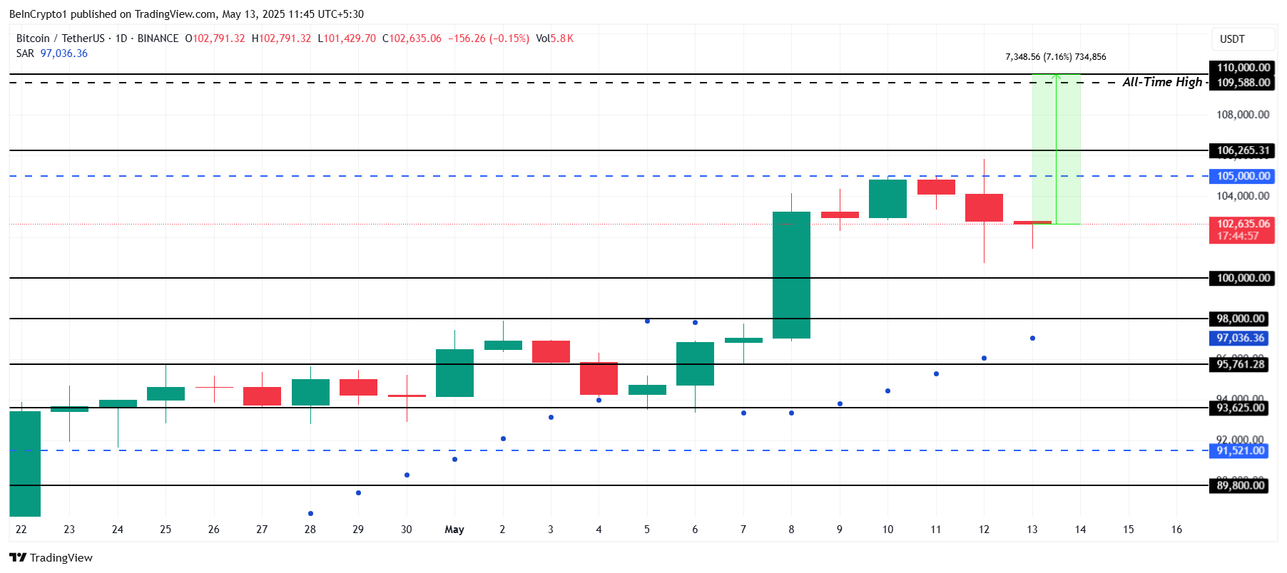 Om Bitcoins positiva momentum återupptas kan det bryta förbi 105 000 USD-motståndet och sikta på 106 265 USD. Ett lyckat genombrott av denna nivå kan driva Bitcoin till 110 000 USD, vilket bildar en ny rekordhög nivå (ATH). Detta skulle markera en betydande milstolpe i Bitcoins pågående uppgång, driven av institutionellt intresse och valackumulering.