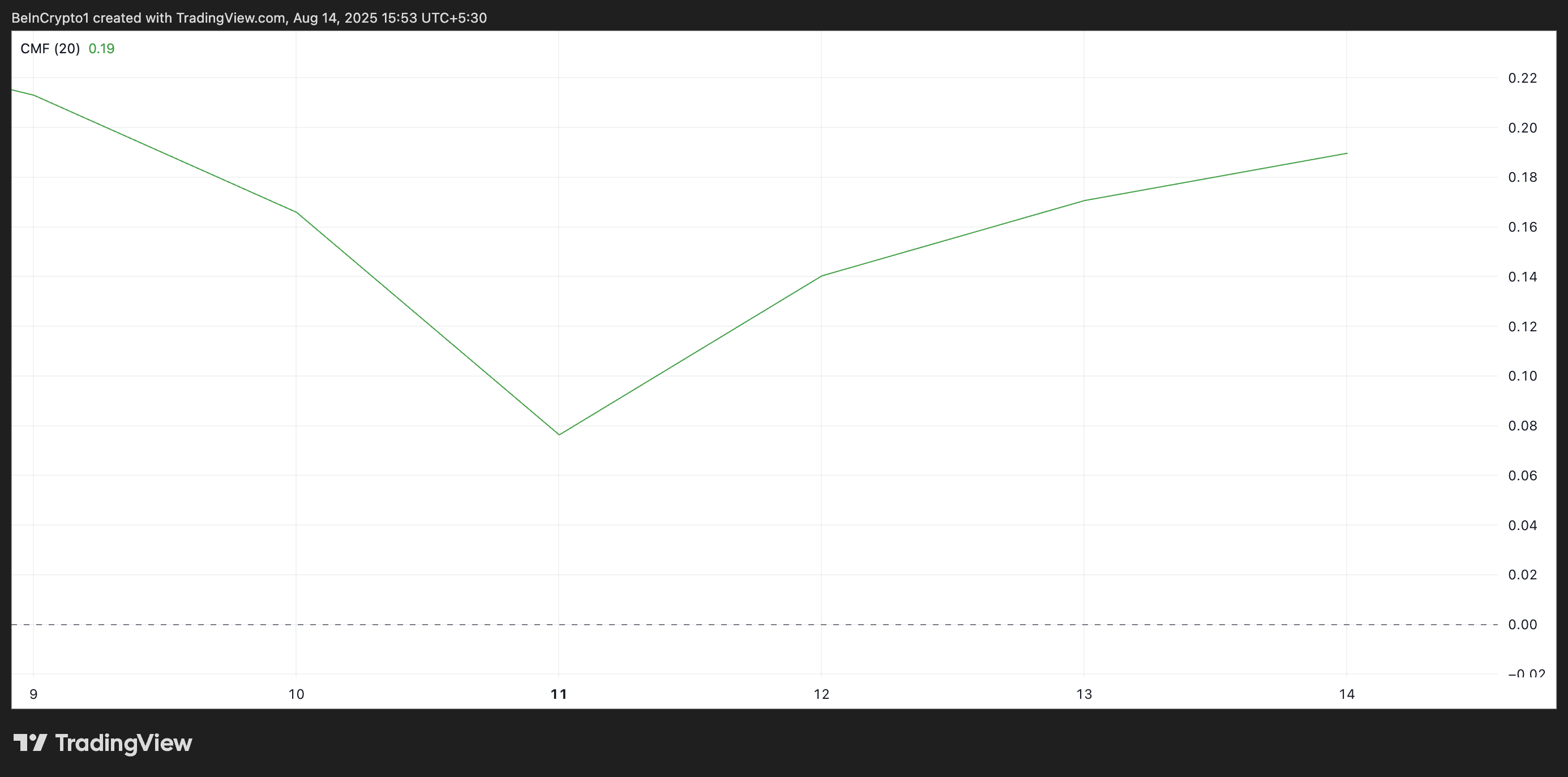 Positiva CMF-avläsningar över noll indikerar att tillgången oftare stänger i den övre delen av sitt pris under den mätta perioden, vilket tyder på att köpare har kontroll. Negativa avläsningar pekar däremot på säljtryck.