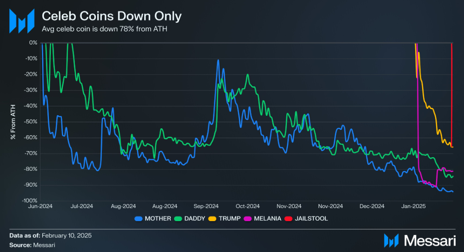 Enligt data från Messari har framstående tokens som MOTHER, DADDY, TRUMP, MELANIA och JAILSTOOL sett en genomsnittlig nedgång på 78 % sedan sina toppvärderingar.