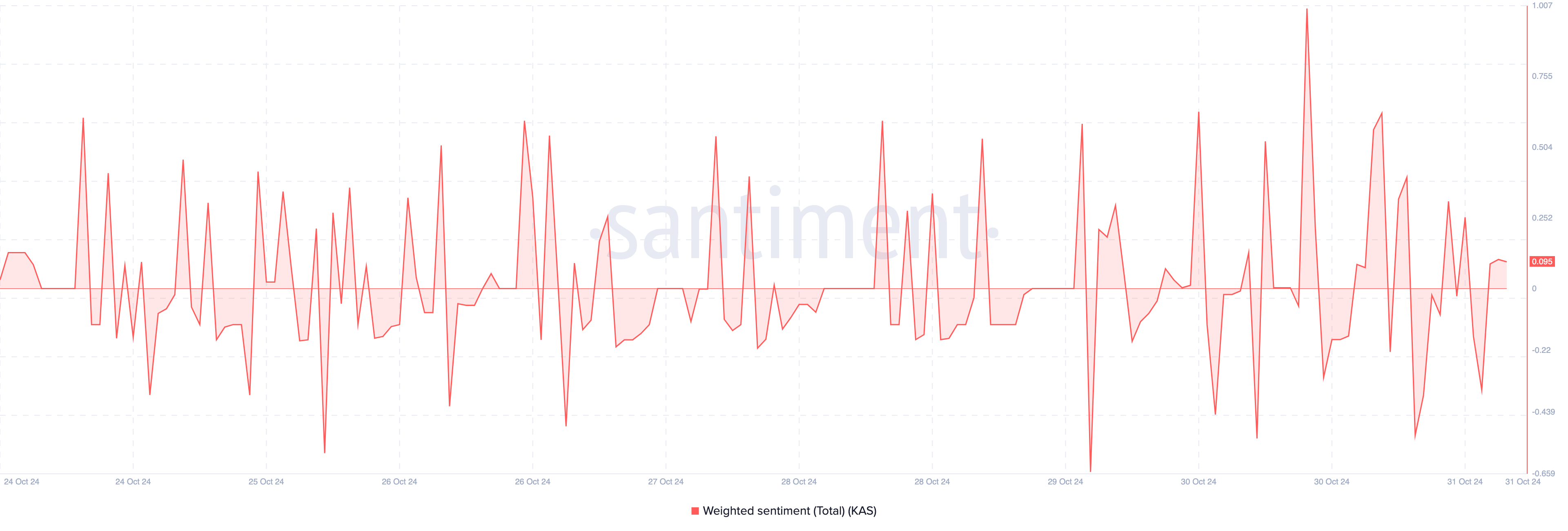 Under tiden visar data från Santiment att det viktade sentimentet för Kaspa har blivit positivt. Detta mått återspeglar marknadsdeltagarnas uppfattningar om kryptovalutan. Vidare indikerar en positiv avläsning att majoriteten av kommentarerna kring projektet är optimistiska. Tvärtom tyder ett negativt sentiment på en rådande tro att priset kanske inte stiger.