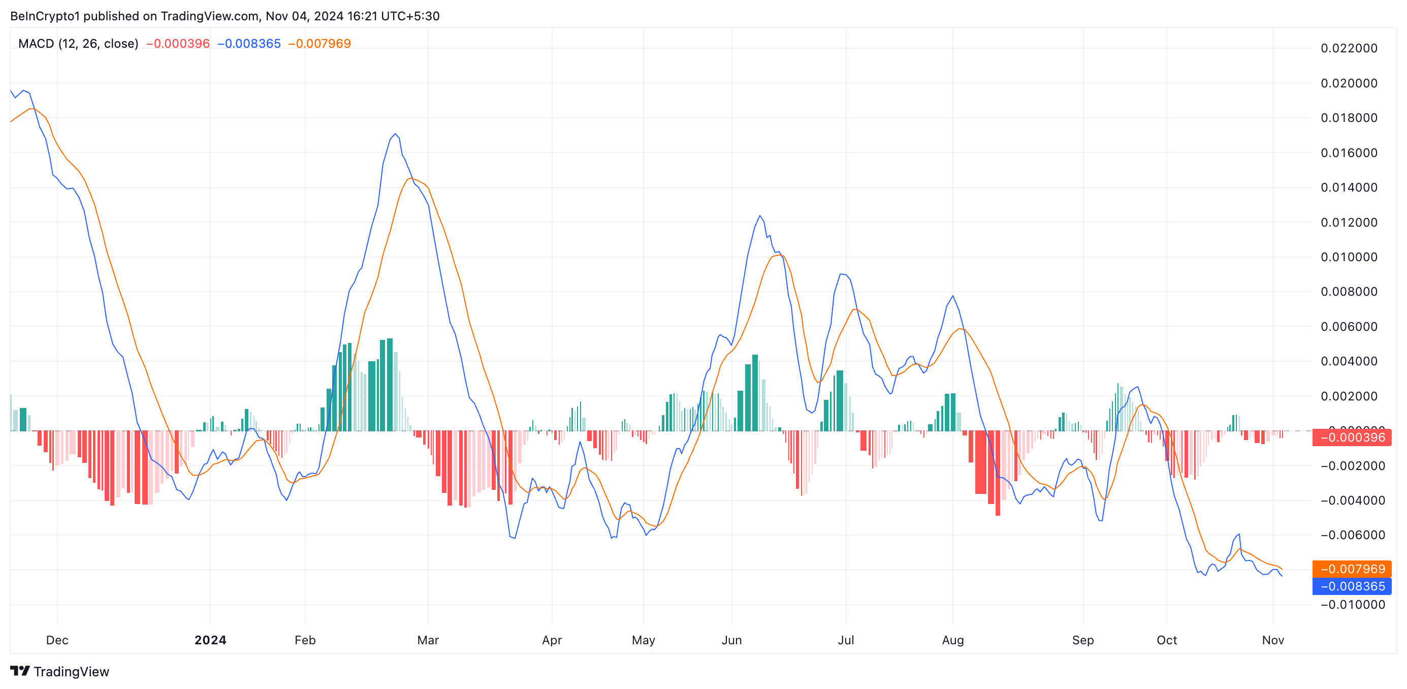KAS dödskorsning signalerar ytterligare nedgång, särskilt med tanke på de björniga avläsningarna på andra indikatorer, såsom dess rörelsemedelvärdeskonvergens/divergens (MACD) indikator — som spårar dess trendriktning, förändringar och potentiella vändpunkter för priset. För närvarande ligger KAS MACD-linje (blå) under dess signalinje (orange) och nollinjen.