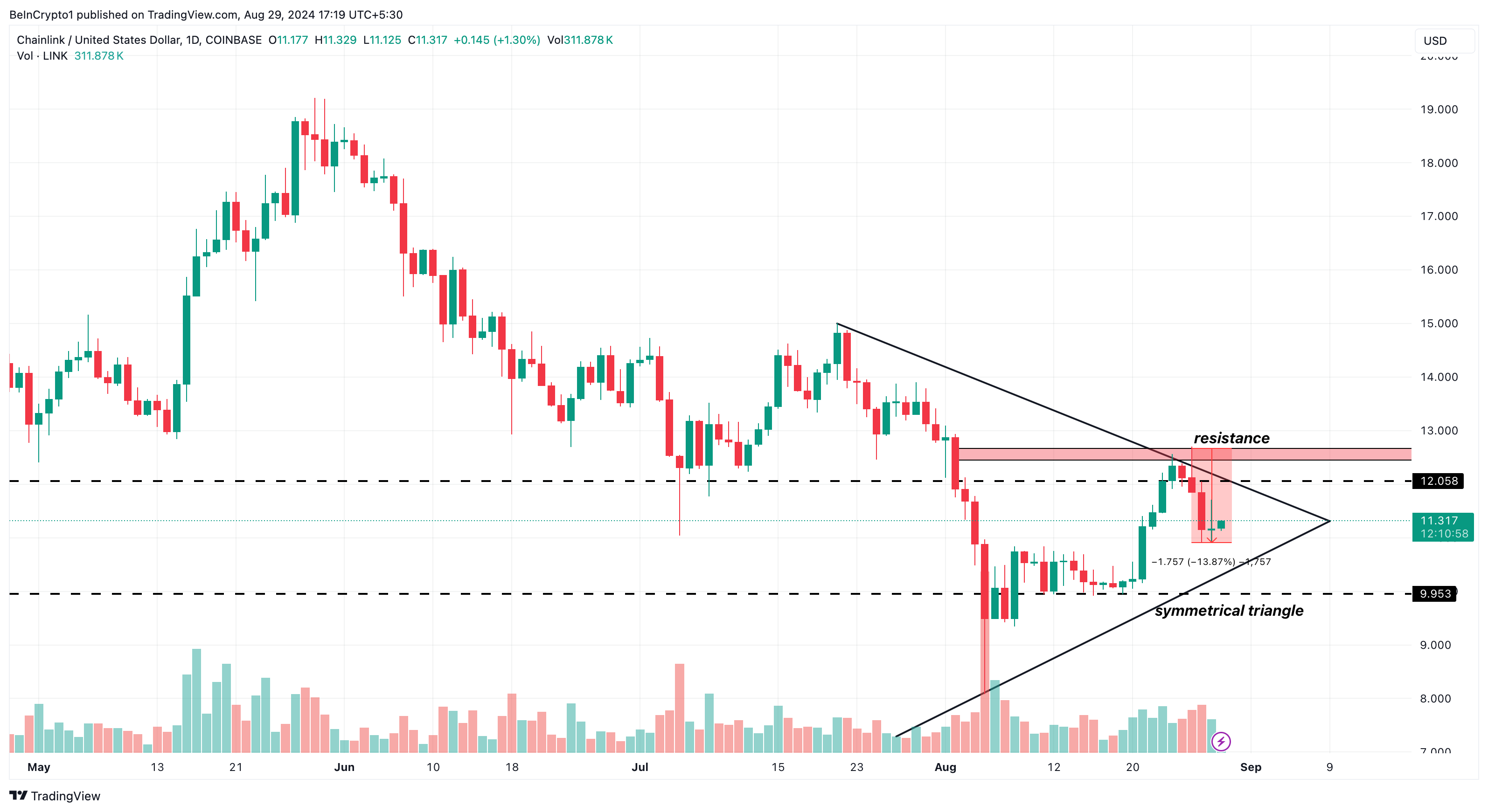 Tidigare i veckan försökte LINK stiga över mönstret efter att tjurarna försvarat stödnivån på 9,95 USD. Priset drog sig dock tillbaka när det stötte på motstånd runt 12,55 USD.