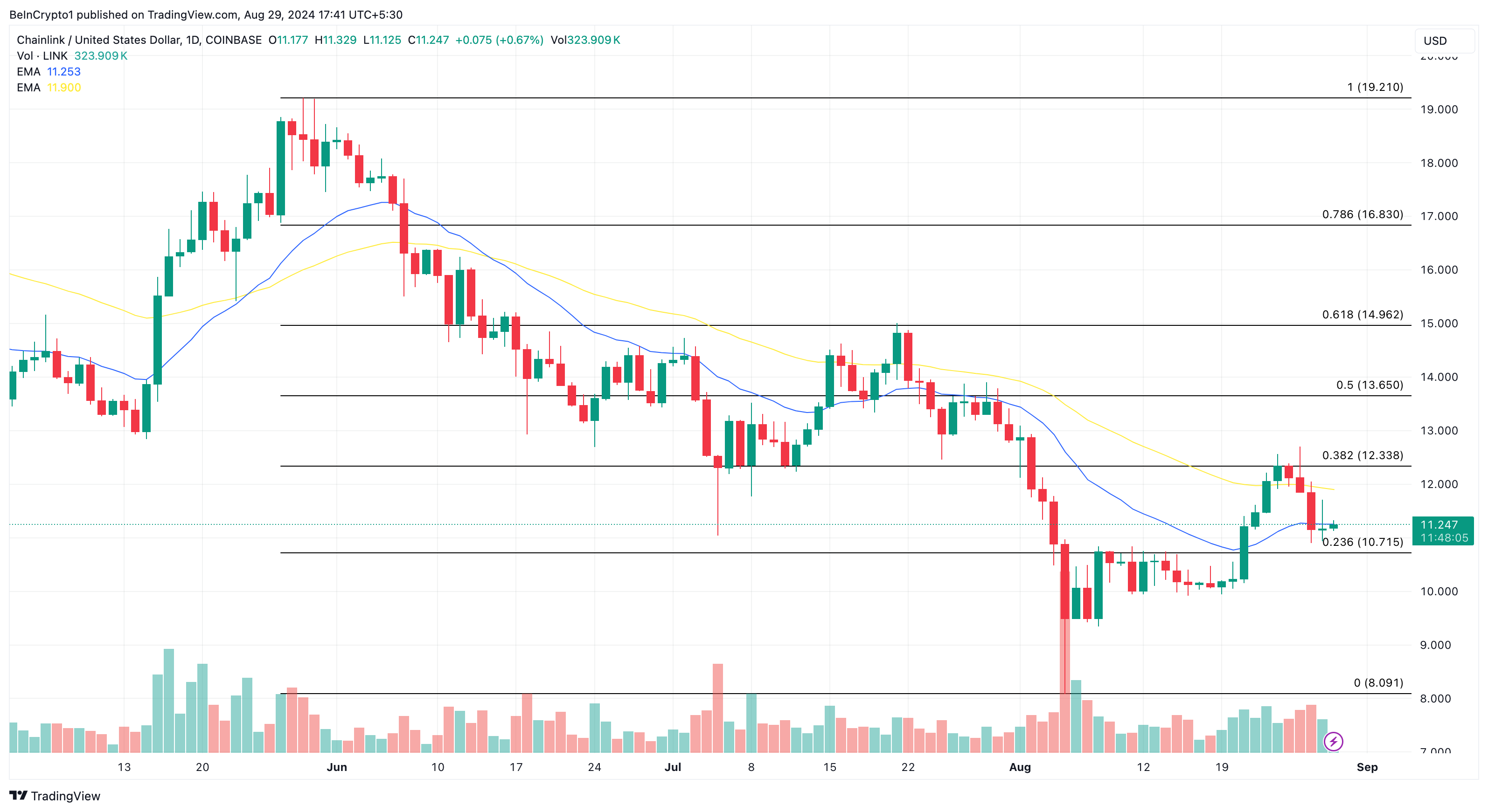 Den 26 augusti hoppade Chainlinks (LINK) pris upp till 12,55 USD, vilket väckte spekulationer om att denna altcoin kunde vara på väg mot ett stort genombrott. Trots ansträngningar att driva priset högre stötte uppgången på hinder, vilket ledde till en nedgång till 11,25 USD.