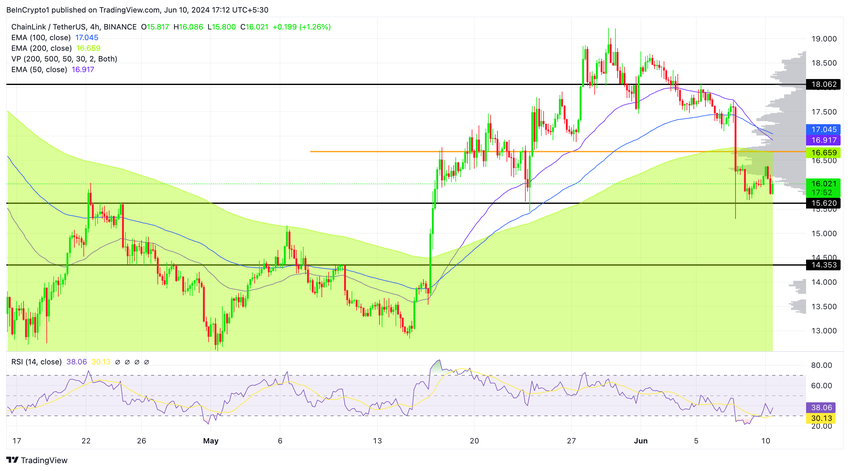 LINK har brutit viktiga stödnivåer, särskilt 17,40 USD, vilket motsvarar 100 EMA (blå linje) på 4-timmarsdiagrammet. Volymprofilen toppar på $ 16,70.