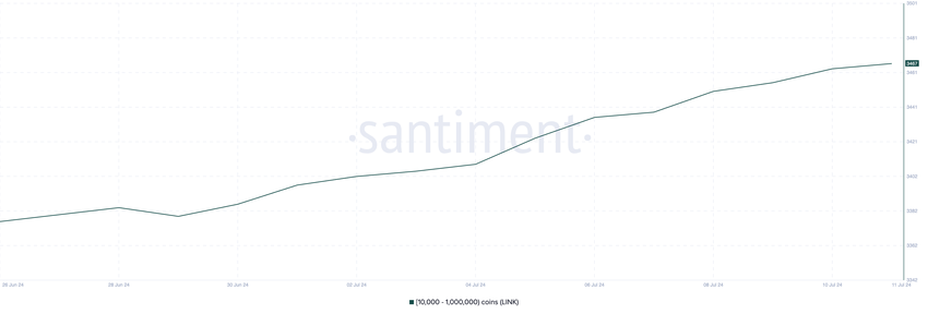 On-chain-data från Santiment visar att LINK-valar har varit upptagna under de senaste veckorna. Antalet LINK-valar som innehåller mellan 10 000 och 1 000 000 tokens har ökat stadigt sedan den 20 juni. Med 3 474 adresser vid presstillfället har deras antal sedan dess ökat med 3,3 %, vilket är det högsta antalet sedan november 2023.