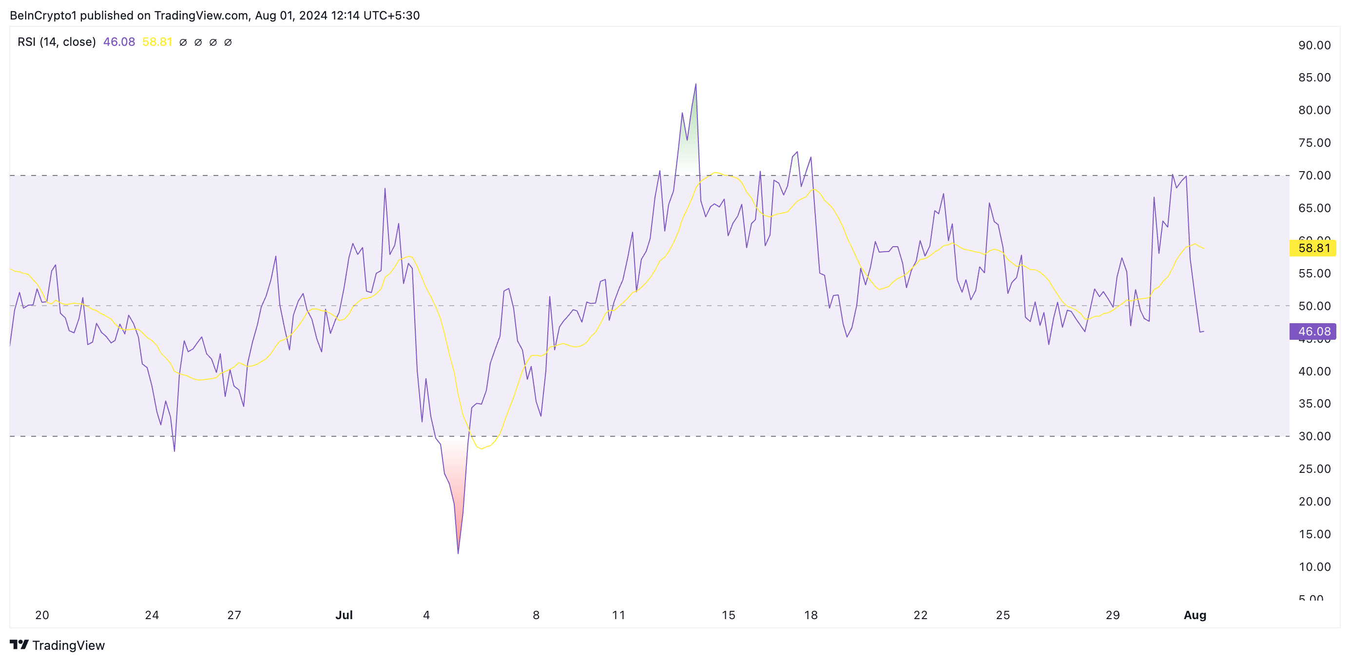 Vidare ligger altcoinens Relative Strength Index (RSI), på 46,08, för närvarande under sin 50-neutrala linje och i en nedåtgående trend. Denna indikator mäter en tillgångs överköpta och översålda marknadsförhållanden.