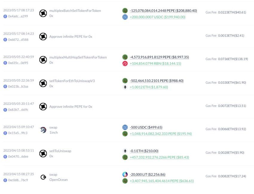 Lookonchain skisserade att näringsidkaren ursprungligen investerade nästan 3 000 dollar den 15 april 2023 för att köpa 4,9 biljoner PEPE-tokens. Sedan dess har PEPE: s värde skjutit i höjden. Detta gjorde det möjligt för näringsidkaren att sälja delar av sina innehav för betydande vinster.