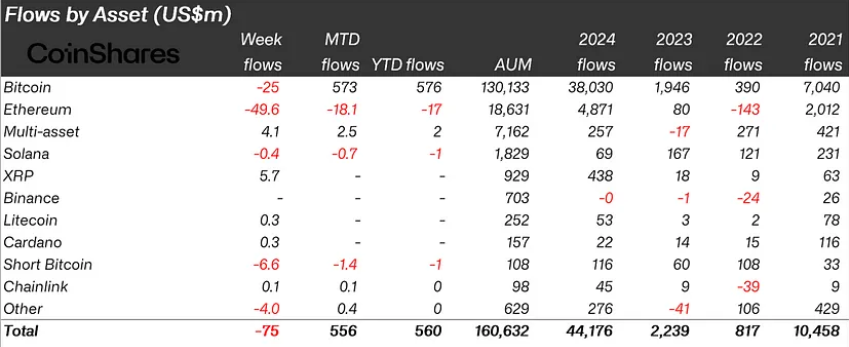 Kryptoinflöden ökade till 585 miljoner USD under de första tre handelsdagarna 2025, vilket markerar en stark start på året. Men hela veckan, som inkluderade de sista två handelsdagarna 2024, hade nettoutflöden på 75 miljoner USD.