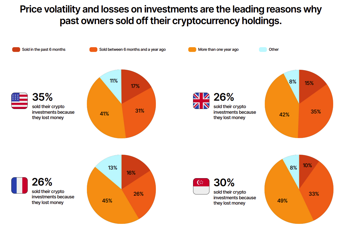 Dessutom verkar de som tidigare lämnat marknaden vara redo att återinvestera. Över 70% av tidigare kryptoägare funderar på att återinvestera inom det kommande året, drivna av en positiv syn på tillgångsklassen. Bland nuvarande ägare är 57% tillräckligt säkra för att göra kryptovalutor till en betydande del av sina investeringsportföljer, och 27% av tidigare ägare är sannolikt att återinträda på marknaden snart.