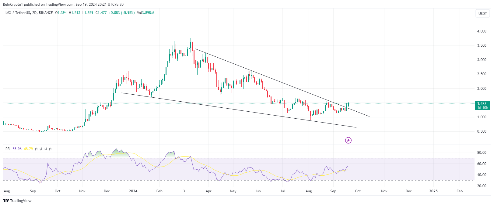 ImmutableX (IMX) är också på Crypto Banters lista över altcoins som är redo att öka under en möjlig altcoinsäsong. Speltoken har brutit sig ur ett fallande kil-mönster, vilket effektivt bekräftar en vändning. Baserat på detta utbrott förväntar sig analytikerna en hausseartad våg.