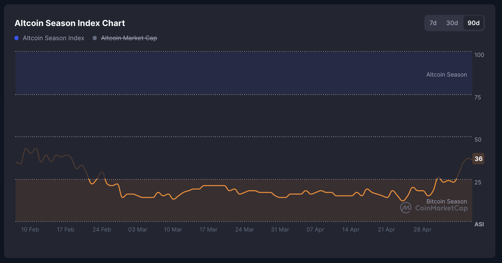 CMC Altcoin Season Index mäter om minst 75 % av de 100 bästa mynten (exklusive stablecoins och tillgångsbackade tokens som WBTC och stETH) har överträffat Bitcoin de senaste 90 dagarna.
