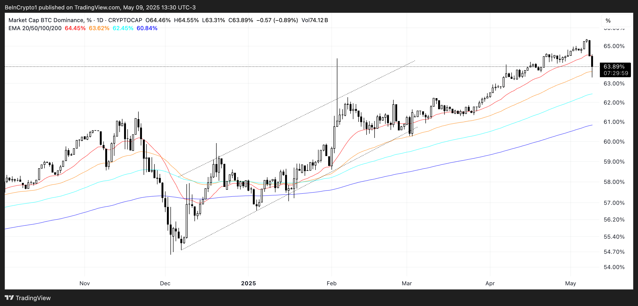 Bitcoin-dominansen sjönk kraftigt från över 65 % till 63,89 % på bara några timmar efter att BTC steg över 100 000 USD för första gången sedan 3 februari.