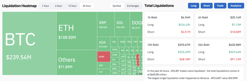 Långa positioner drabbades hårdast och stod för 529,4 miljoner USD i förluster. Samtidigt såg korta positioner 91,1 miljoner USD i likvidationer.