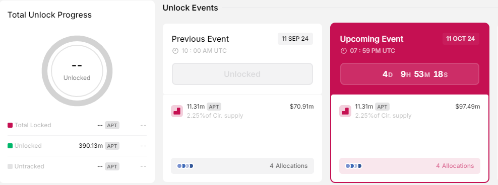 På fredagen den 11 oktober är Aptos-ekosystemet inställt på att låsa upp 11,31 miljoner APT-tokens, värda 97 miljoner USD baserat på nuvarande priser. Dessa tokens kommer att distribueras bland stiftelsen, communityn, kärnmedarbetare och investerare.