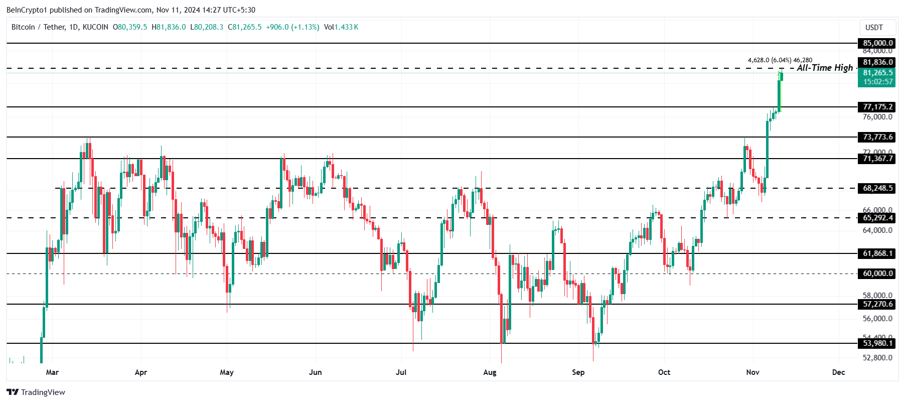 Bitcoin har upprätthållit en veckolång trend av att nå nya rekordhöga värden, med den senaste toppen på 81 836 USD. För närvarande handlas den något lägre till 81 265 USD, och BTC:s konstanta vinster fortsätter att locka investerare, vilket markerar Bitcoin som en toppresterare på marknaden.
