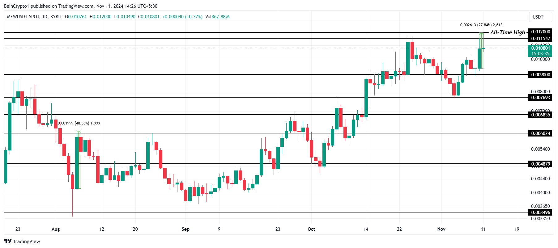 MEW har följt Bitcoins senaste momentum och nått ett nytt rekordhögt värde på 0,0120 USD. Med en ökning på 27 % under de senaste 24 timmarna visar den katt-temade meme-myntet tecken på att fortsätta sin uppåtgående trend eftersom investerarintresset växer.