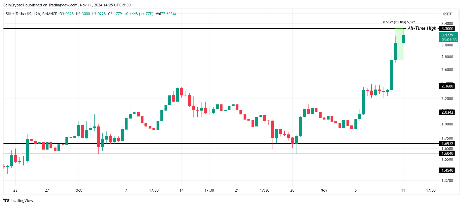 SUI:s pris har ökat med 20 % under de senaste två dagarna och nått ett nytt rekordhögt värde på 3,30 USD. Detta markerar det tredje ATH för SUI under den senaste veckan, vilket återspeglar ett ihållande investeraroptimism och starkt momentum för altcoin när det drar till sig allt mer uppmärksamhet på marknaden.