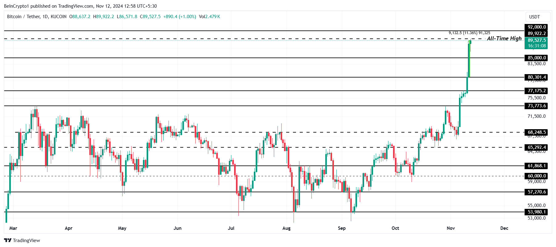 Bitcoins pris hoppade upp 11% under de senaste 24 timmarna, och nådde en ny rekordhög nivå på 89 922 USD. Med ökande momentum siktar den ledande kryptovalutan nu på ett viktigt motstånd vid 92 000 USD, vilket för den närmare den mycket efterlängtade 100 000 USD-gränsen som fångat investerares uppmärksamhet.