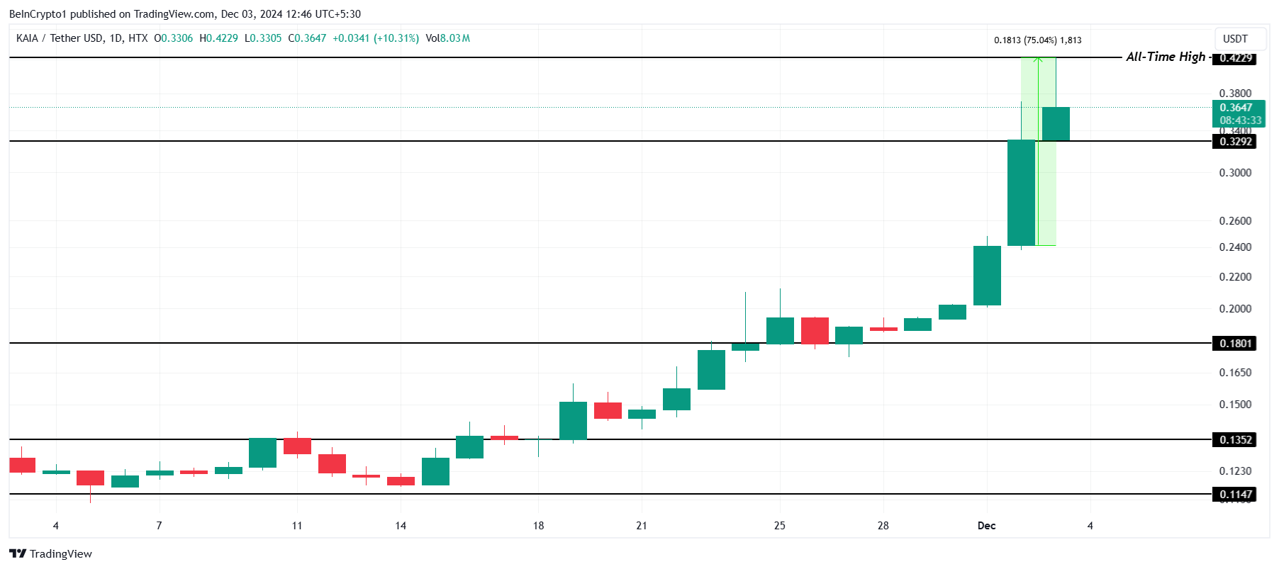 En annan kryptotoken, KAIAS pris steg med 75 % under de senaste 24 timmarna och nådde en ny rekordnivå (ATH) på 0,422 USD. Detta betydande hopp har placerat KAIA bland de bästa på kryptomarknaden.