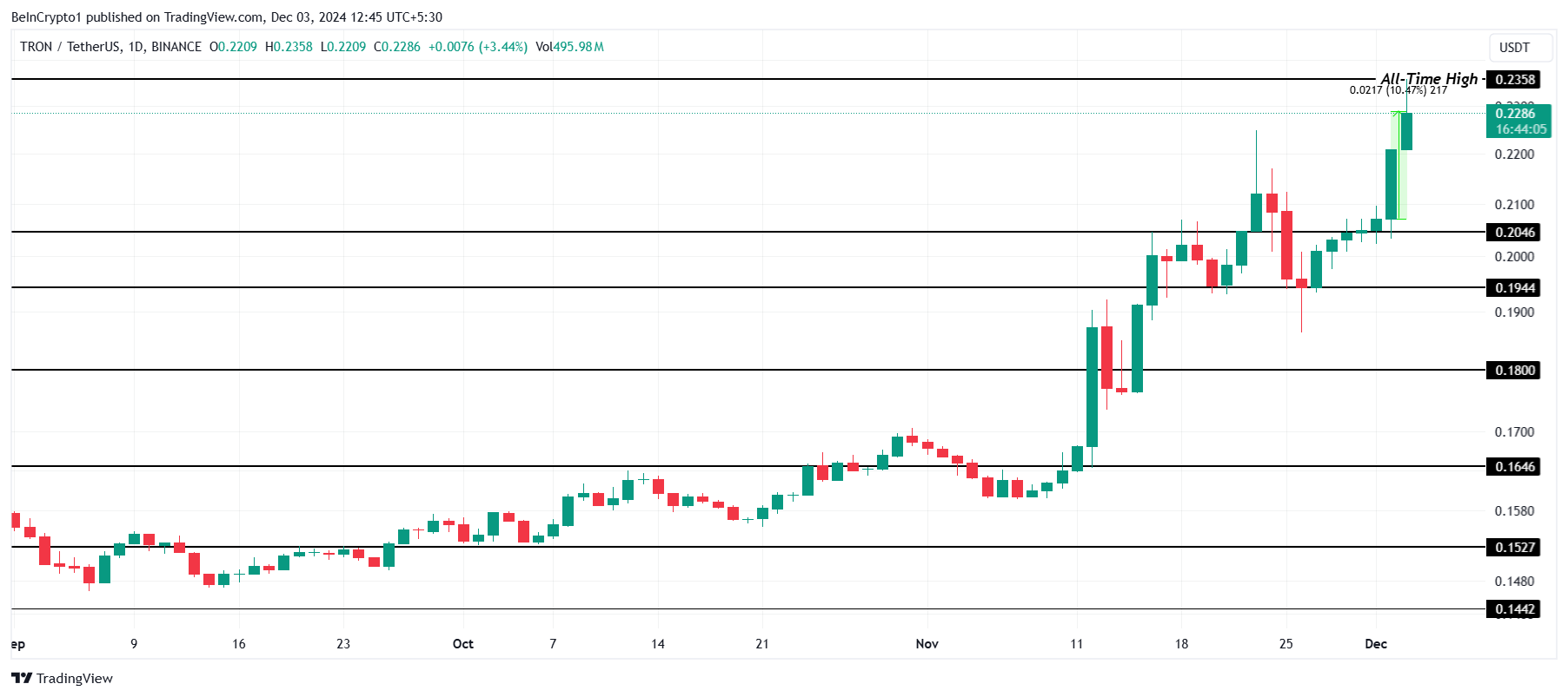 Trons pris är för närvarande 0,228 USD, vilket är en ökning med 10 % under de senaste 24 timmarna. Altcoin nådde en ny rekordnivå (ATH) på 0,235 USD under dagens handel. Denna senaste ökning visar på växande investerarförtroende och stärker den positiva känslan kring TRX på kryptomarknaden.
