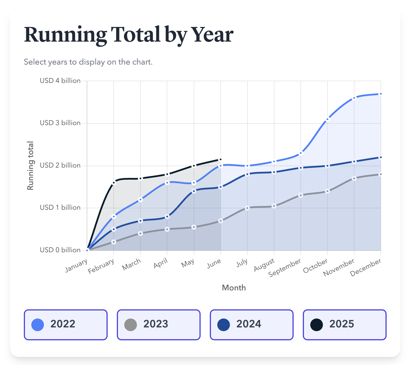 Detta innebar en ökning med 10 % jämfört med det tidigare rekordet på 2 miljarder USD som stals under första halvåret 2022. Dessutom är beloppet nästan lika stort som de medel som stals under hela 2024.