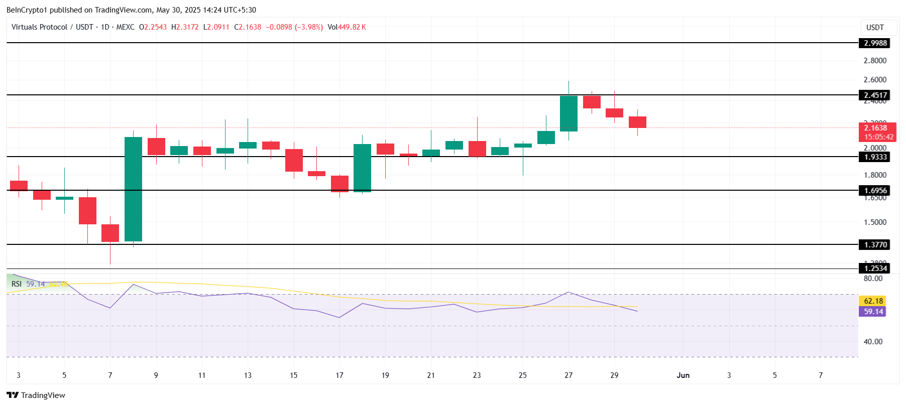 RSI ligger kvar i den positiva zonen, över den neutrala gränsen, vilket stöder VIRTUAL:s positiva momentum. Detta momentum kan hjälpa altcoinet att säkra 2,45 USD som en stödnivå, vilket potentiellt kan driva priset mot 2,99 USD och slutligen nå 3,00 USD.