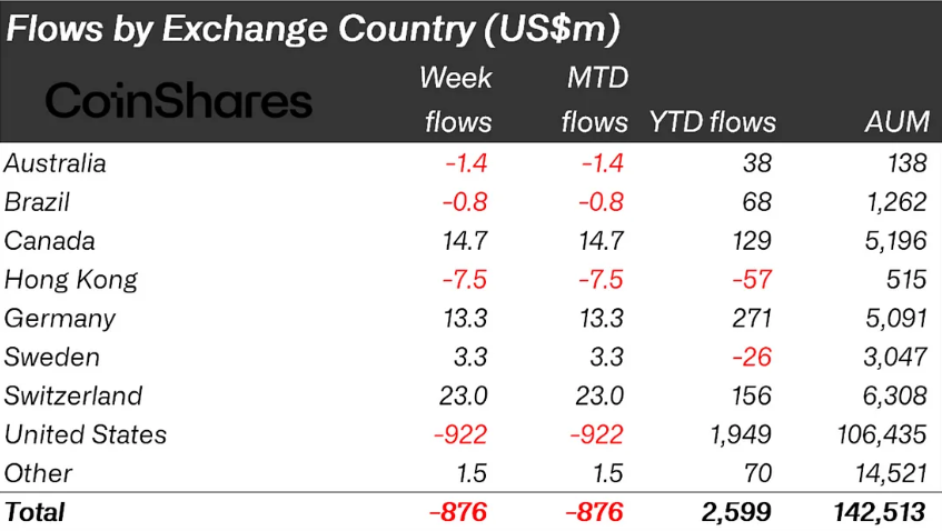 Den senaste CoinShares rapporten visar att amerikanska investerare främst drev utflödena, genom att dra tillbaka 922 miljoner USD från digitala tillgångsinvesteringsprodukter. Denna negativa inställning i USA kontrasterade med andra regioner, där investerare såg den senaste marknadskorrigeringen som ett köptillfälle.