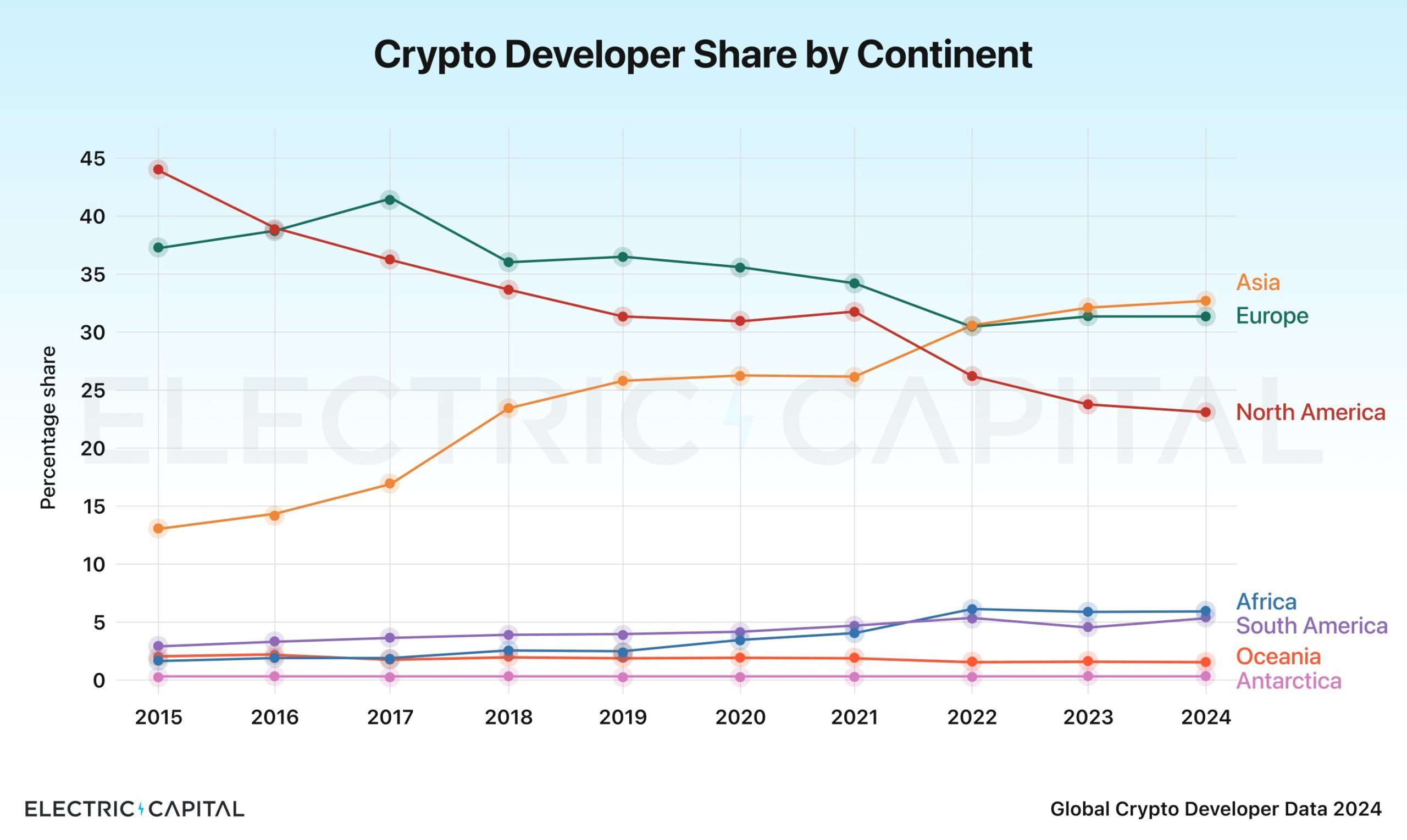 Studiens resultat visar även en tydlig förskjutning i andelen kryptoutvecklare i Asien och Nordamerika. Medan Asiens andel har ökat från 13 % till 32 % sedan 2015, har Nordamerikas andel minskat från 44 % till 24 %.