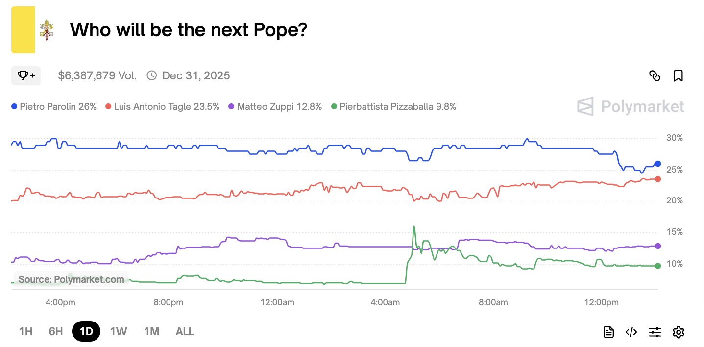 Polymarkets marknad för att förutsäga nästa påve nådde idag över 6,4 miljoner USD i totala insatser efter att ett viralt skämt falskt påstod att den katolska kyrkan avsåg att bannlysa spelare.