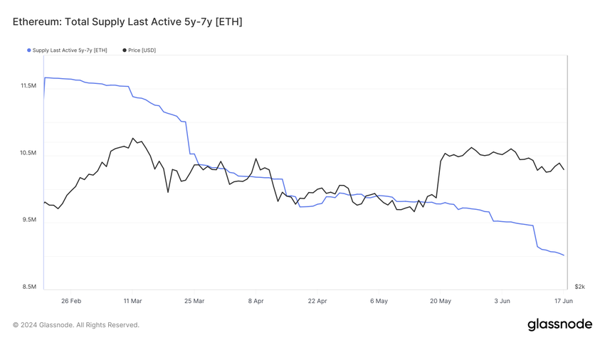 Dessutom indikerar en bredare trend bland Ethereum-innehavare ett liknande minskningsmönster. Data från on-chain-analysplattformen Glassnode avslöjar en märkbar minskning av det totala utbudet av ETH som hade förblivit orört i fem till sju år. Detta mått har minskat med över 22 % och sjunkit från 11,6 miljoner ETH-tokens i slutet av februari till nuvarande 9,01 miljoner ETH.