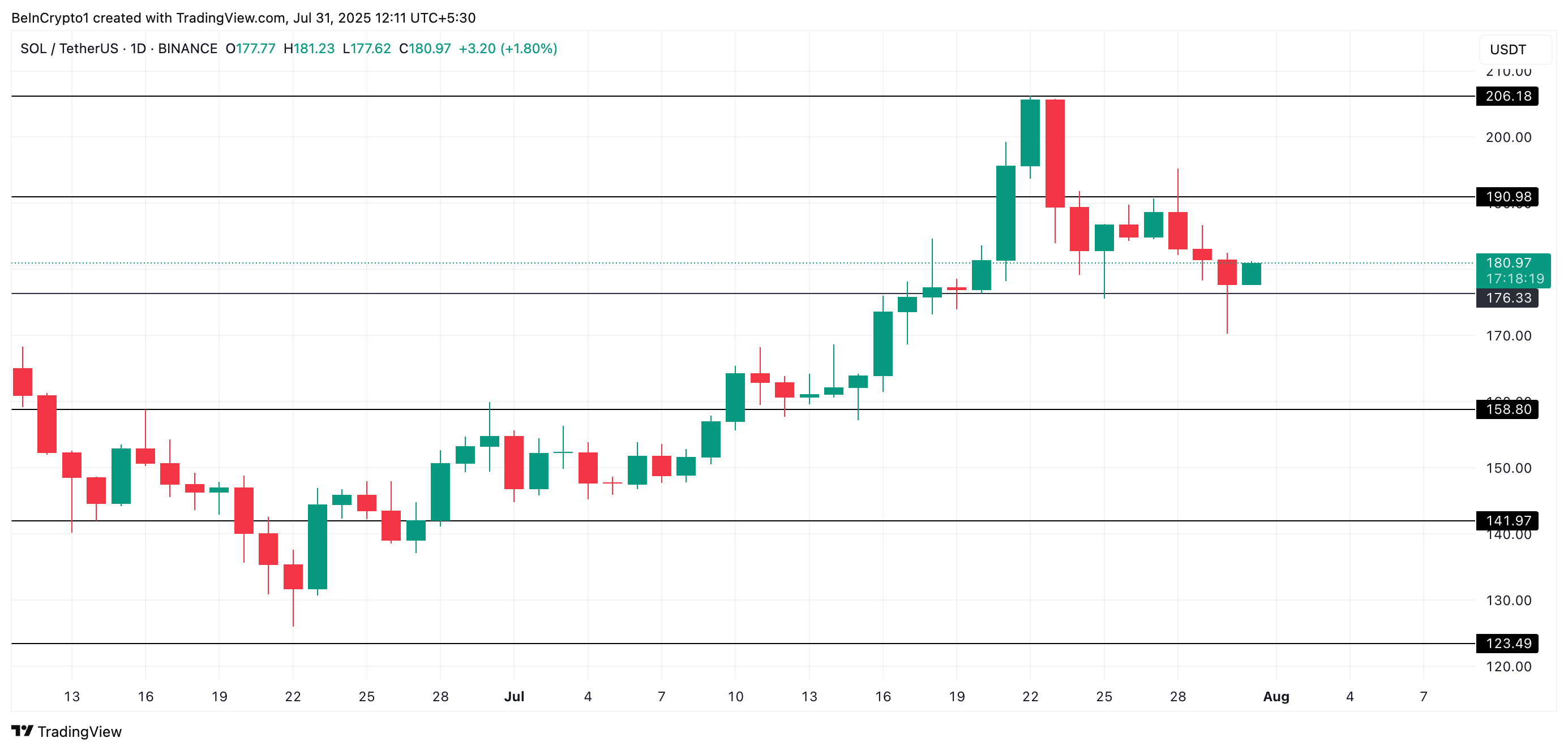 SOL:s blygsamma prisnedgång på 2 % under den senaste veckan har gett valar en köpmöjlighet, eftersom många förväntar sig en förlängd positiv återhämtning i augusti. För att sätta det i sammanhang har SOL rört sig nedåt sedan den nådde en topp på 206,18 USD den 22 juli.