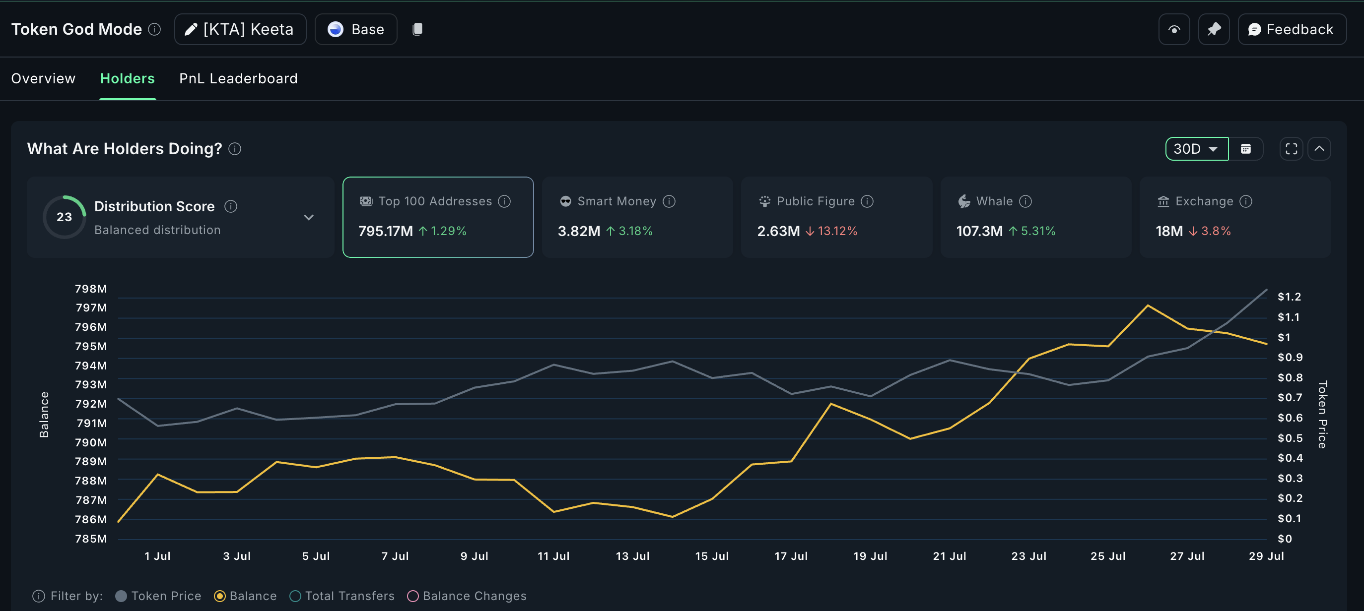 Priset har stigit med +44,6 % de senaste 7 dagarna, vilket tyder på att smart kapital redan positionerar sig inför september. Med en balanserad distributionspoäng på 23 är ägarspridningen sundare, vilket ofta stödjer prisstabilitet under volatila perioder.