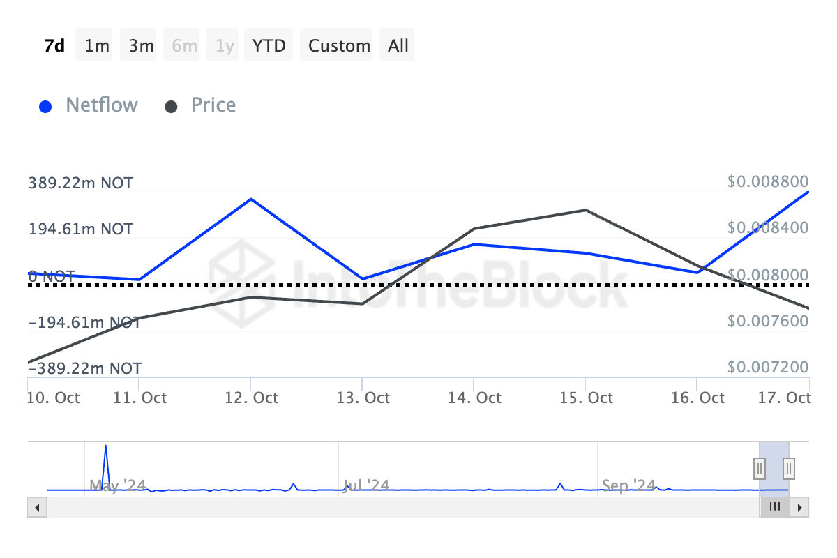 Telegram-länkade Notcoin är en annan mynt som kryptovalar köpte den här veckan. Enligt IntoTheBlock har dess stora innehavares nettoflöde skjutit i höjden med över 2 000% under de senaste sju dagarna.