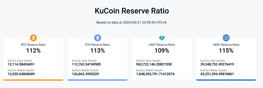 KuCoins senaste PoR visar att dess reservkvot för användarhållna tillgångar består av 12,115 Bitcoin (BTC), 112,763 Ethereum (ETH), 963,72 miljoner USDT och 39,35 miljoner USDC. Det aktuella beloppet återspeglar en betydande minskning av dess innehav av viktiga kryptovalutor.